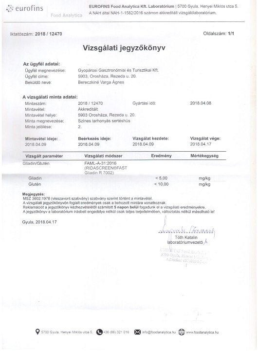 A MEGRENDELŐINK BIZTONSÁGA ELSŐDLEGES! Az akkreditált mintavétellel készült szakvélemények szerint ételeink glutén és gliadin tartalma a mérhetetlen tartományban volt, GLUTÉNMENTESEK. Itt olvashatóak a legfrissebb gluténmentességet igazoló vizsgálati jegyzőkönyveink: (További jegyzőkönyveket talál a honlapunk "Ételeinkről" oldalának alsó részén.) 2018_GM_Szines_tarhonyas_serteshus_530 2018_GM_Speko_Sef_kenyer_5302018_GM_Burgonyafozelek_530