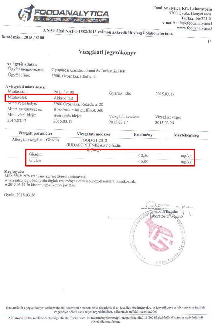 Melyek a legfontosabb információk a jegyzőkönyvön? Piros kerettel kiemelve, hogy a mintavétel "Akkreditált" - ez a legszigorúbb mintavételi forma. Az akkreditált mintavételezési tevékenységet végző laboratóriumok a Nemzeti Akkreditáló Testület (NAT) által akkreditált szervezetként végzik tevékenységüket, és az akkreditált státuszhoz méltóan a felkészült mintavevő személyzet és a precíz, kifogástalan mintavételezés minőségi elkötelezettségük fontos eleme. A vizsgált "Birsalmás mini muffinok"-ban a Gliadin mennyisége kevesebb, mint 2,5 mg/kg és a Glutén tartalom kevesebb, mint 5 mg/kg. -akkor mondhatjuk, hogy egy élelmiszer GLUTÉNMENTES, ha gluténtartalma nem haladja meg a 20 mg/kg-ot (41/2009/EK rendelet és 828/2014/EU rendelet).